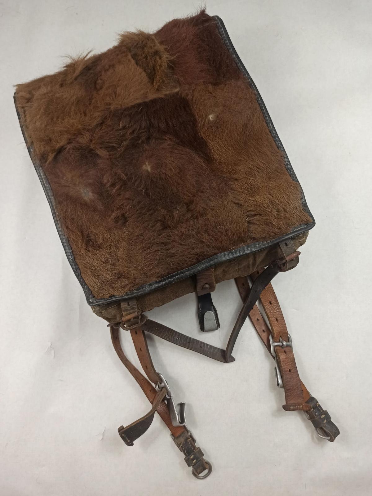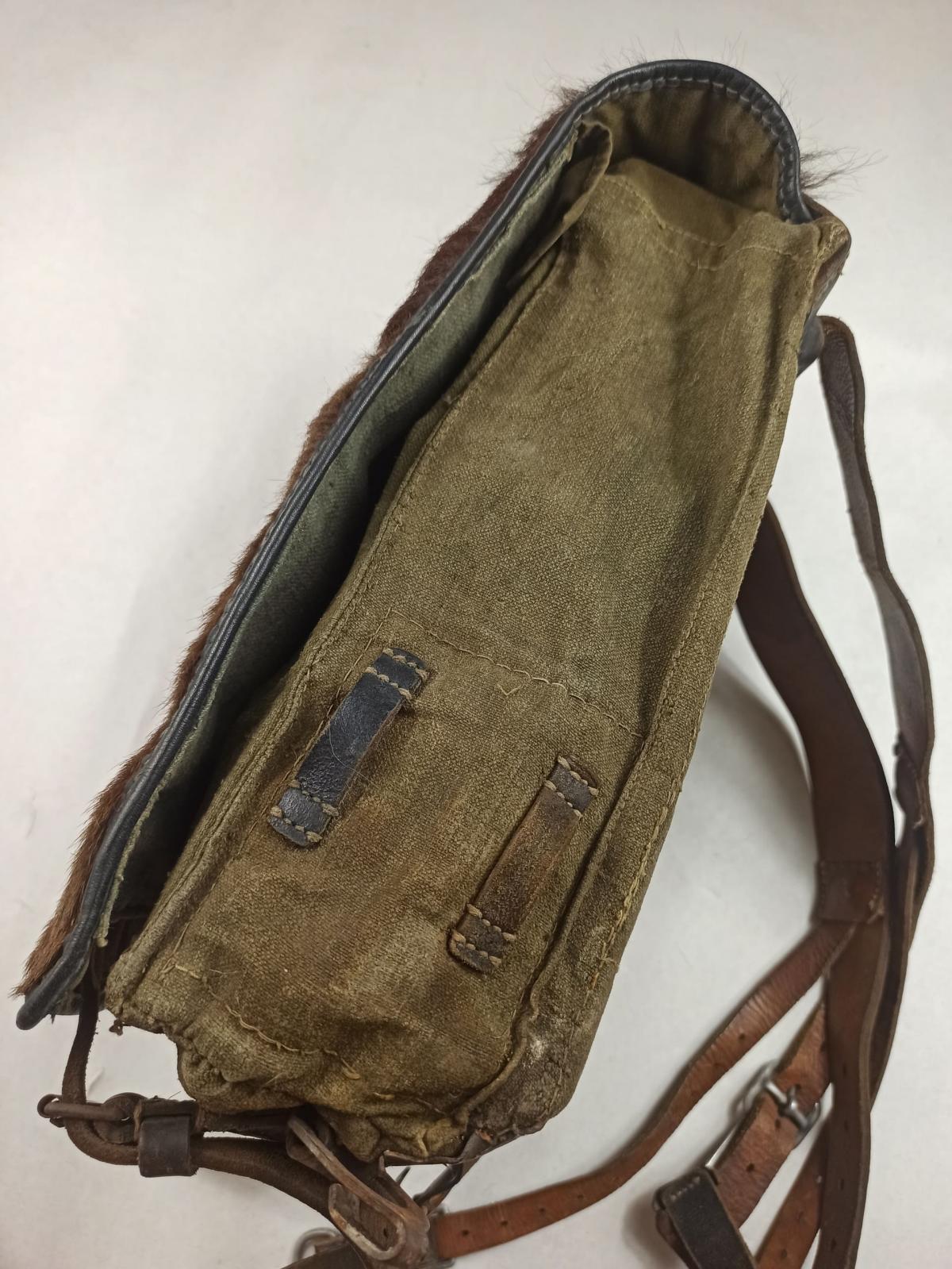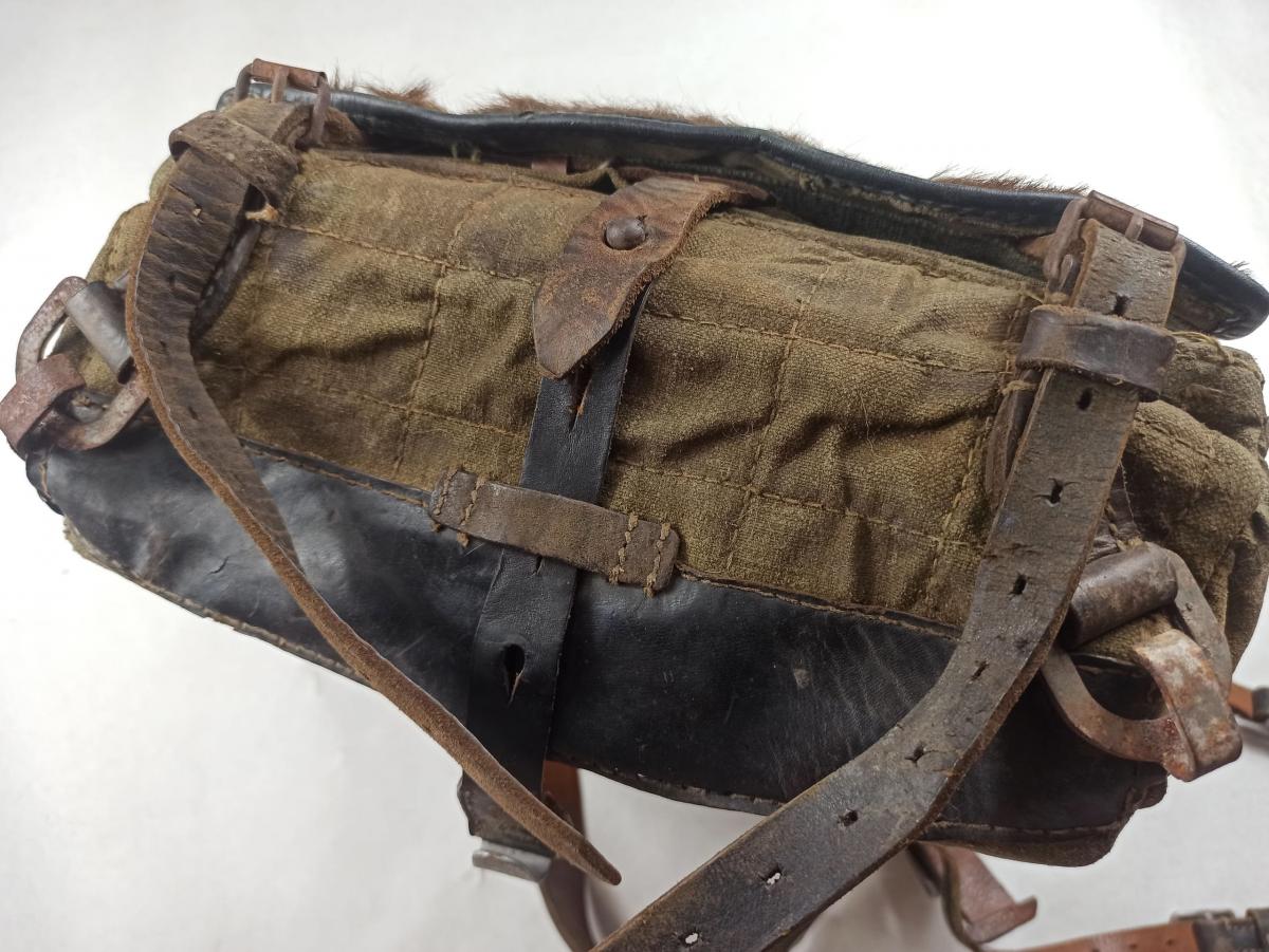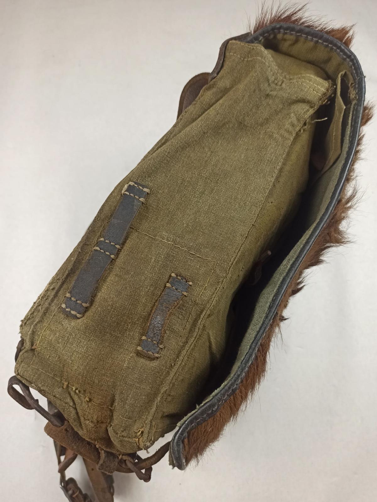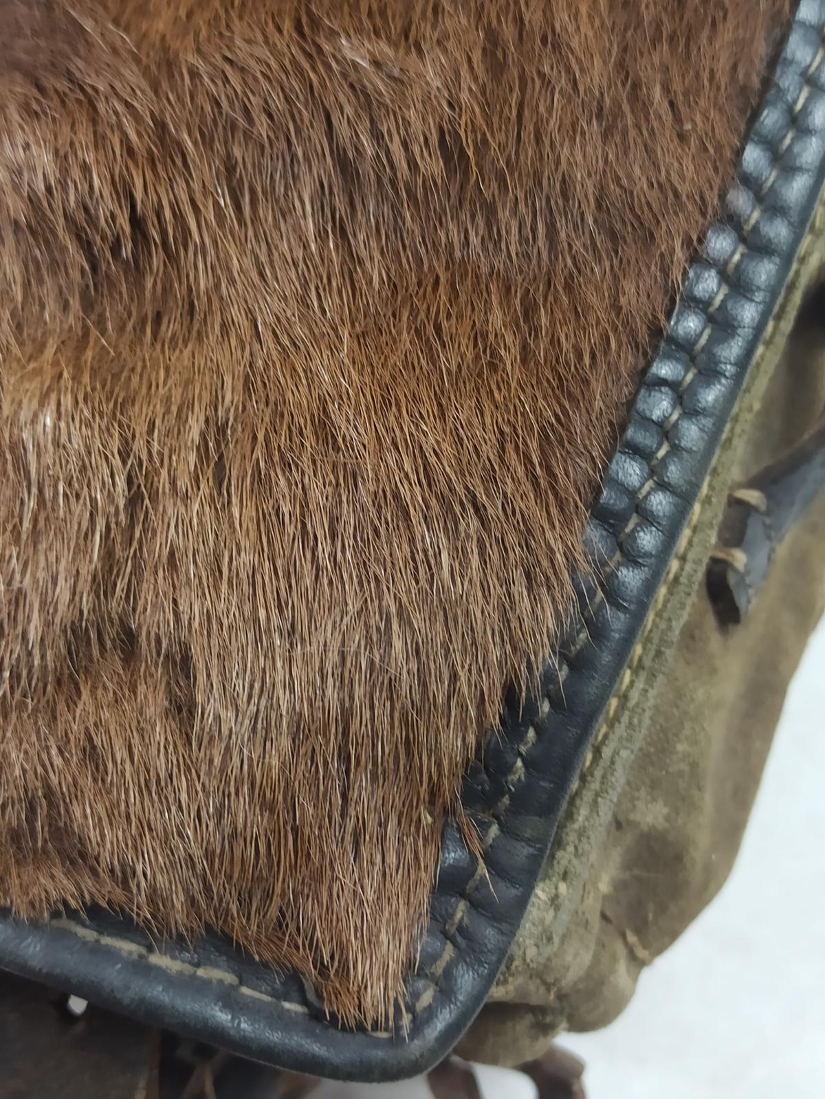 Собран из разных кусков ткани, внутри вообще какая то гражданская тряпка в клетку. Очень занятный, приятный. Клапан так же наборный , из нескольких кусков меха. Этакий франкенштейн. Пыльный, нуждается в чистке. Но хороший и весьма бодрый. Ремни на фото, в комплект не входят. От того и цена соответствующая.