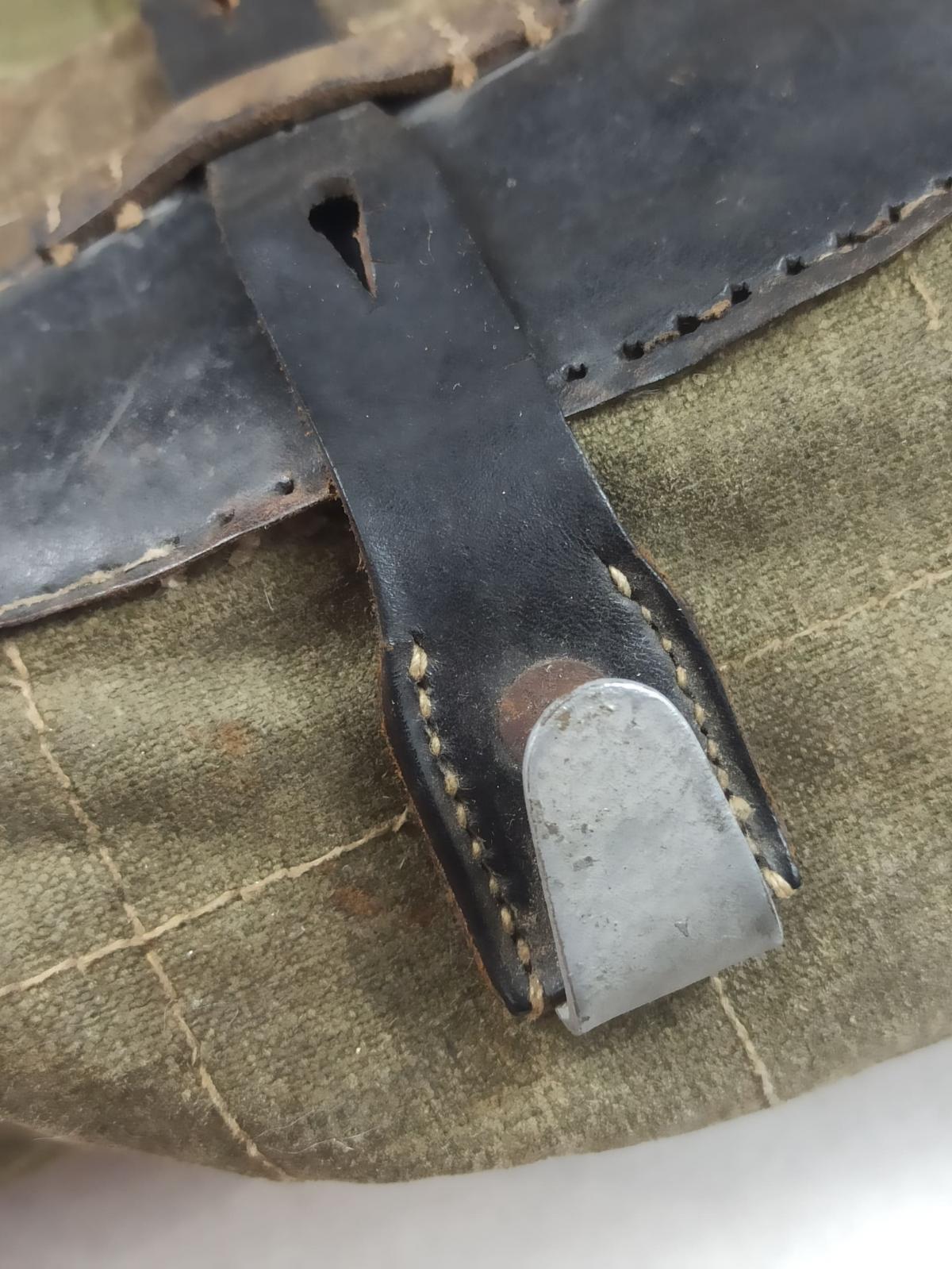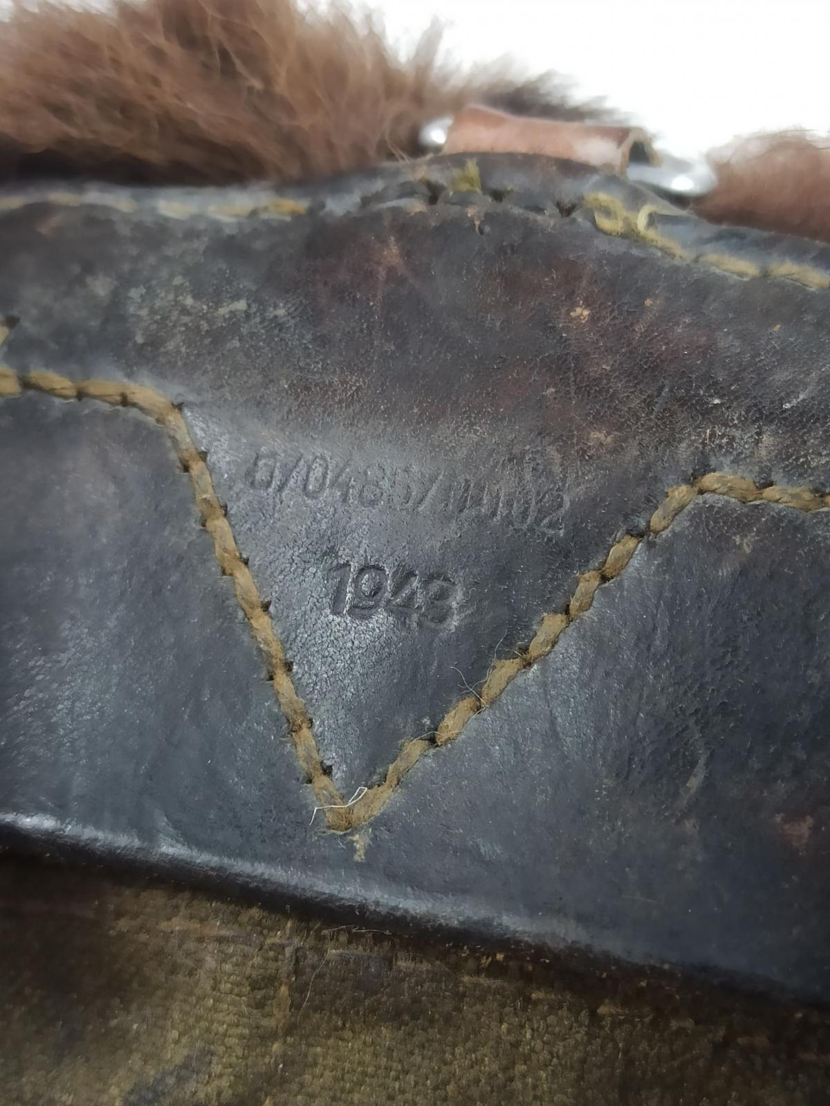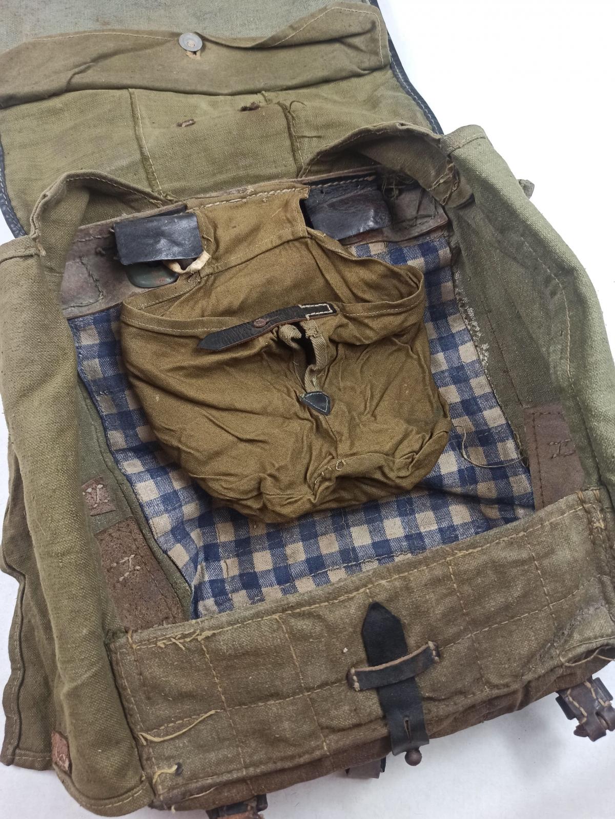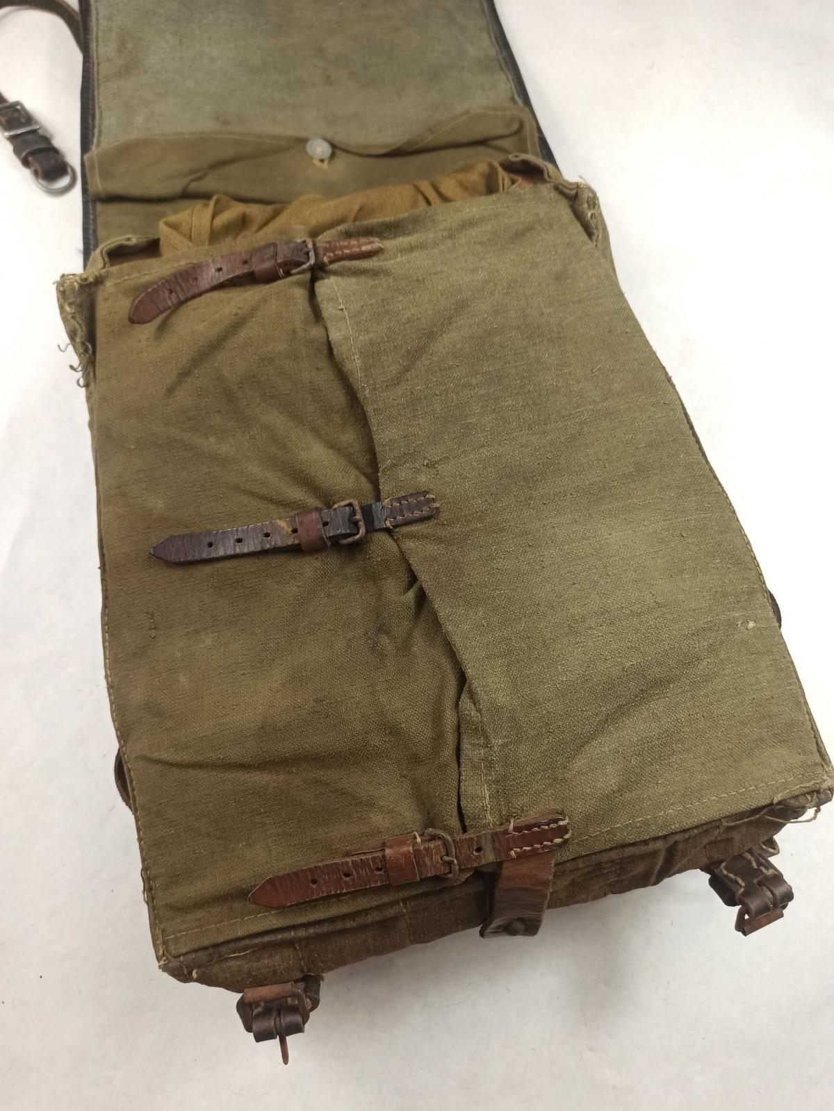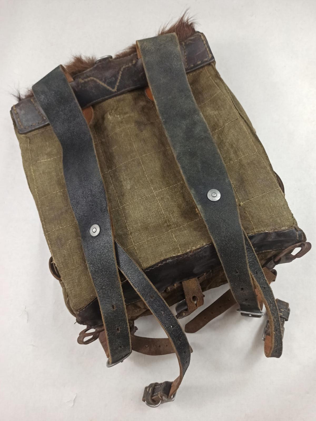 Собран из разных кусков ткани, внутри вообще какая то гражданская тряпка в клетку. Очень занятный, приятный. Клапан так же наборный , из нескольких кусков меха. Этакий франкенштейн. Пыльный, нуждается в чистке. Но хороший и весьма бодрый. Ремни на фото, в комплект не входят. От того и цена соответствующая.
