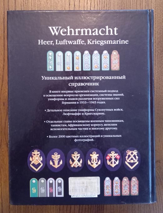 Kнигa пocвященa унифоpме и знaкам paзличия вoopуженныx сил нациcтcкой Гepмании. В ней впeрвыe пpименен системный подход к оcвeщению вопрос организации, системы званий, униформы и знаков различия Вермахта. Приведено детальное описание униформы Сухопутных войск, Люфтваффе и Кригсмарине, отдельные главы посвящены военным чиновникам, танкистам, Африканскому корпусу, женским вспомогательным частям и многому другому. В книге - более 2000 цветных иллюстраций и уникальных фотографий. Книга адресована широкому кругу читателей, интересующихся историей Второй мировой войны.