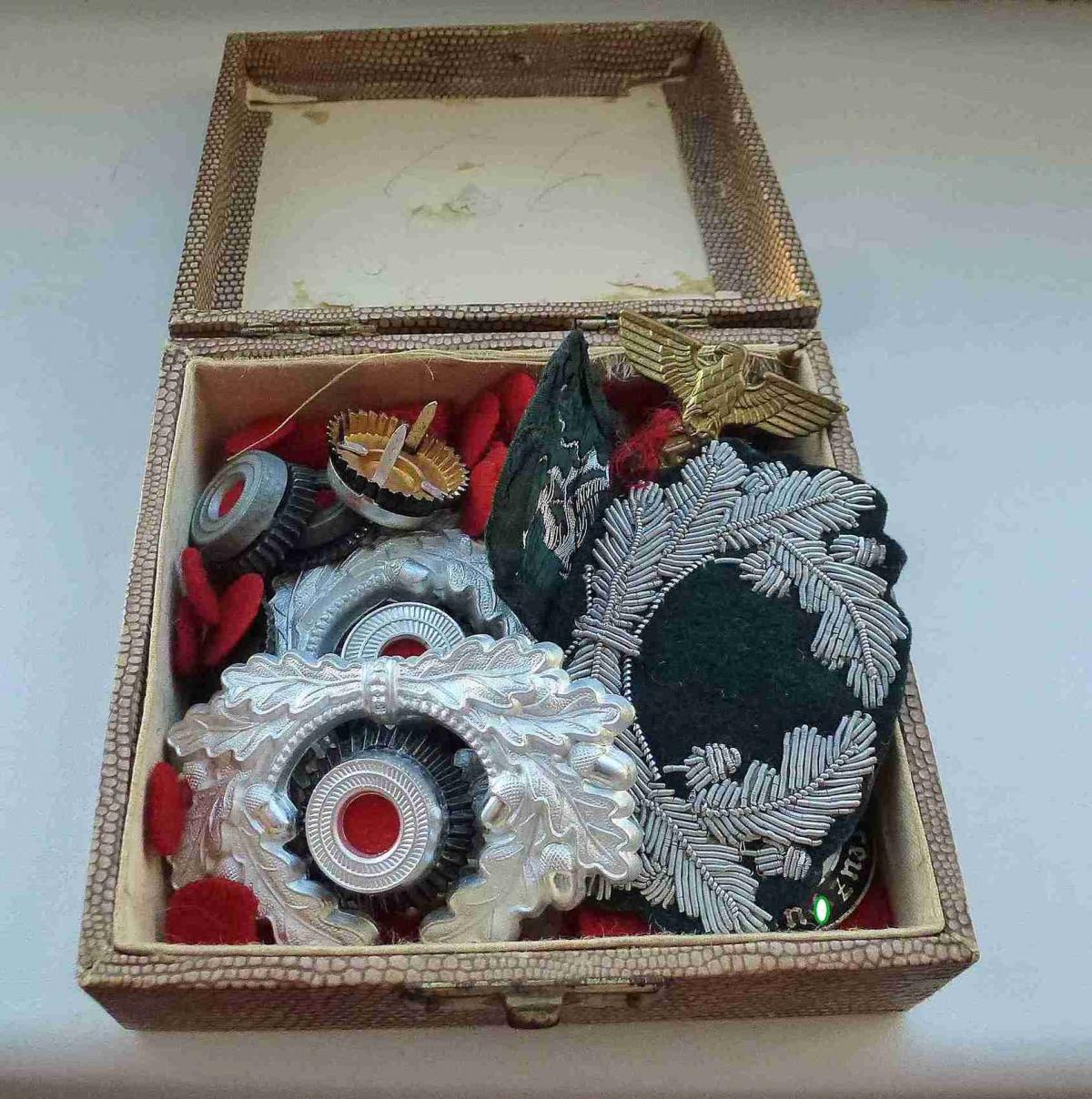 Была куплена коробка с разными кокардами, в которой лежали два куска сукна и также несколько вставок разного диаметра.