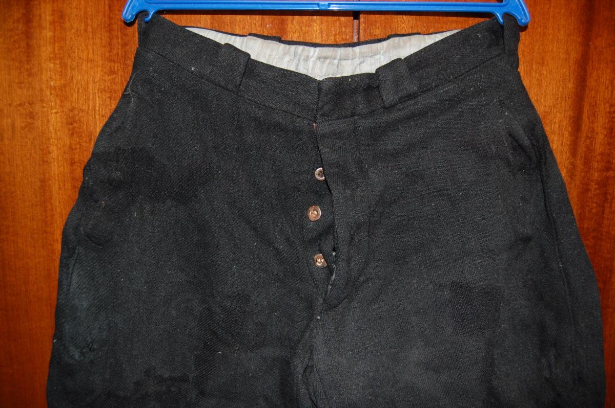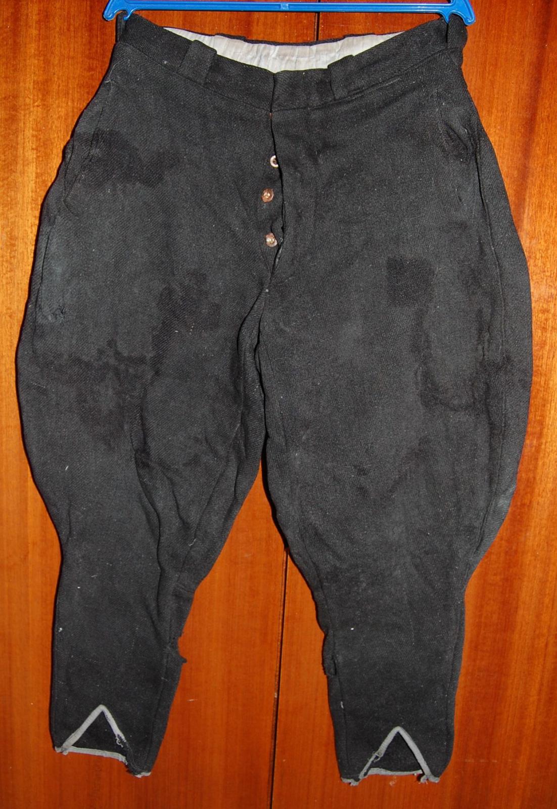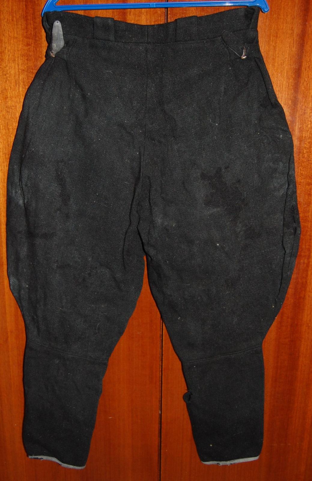 Черные суконные галифе 1940-50-х гг В поясе 78 см, длина 90 см. На штанинах нужно зашить два небольших недочета. В остальном недостатков нет