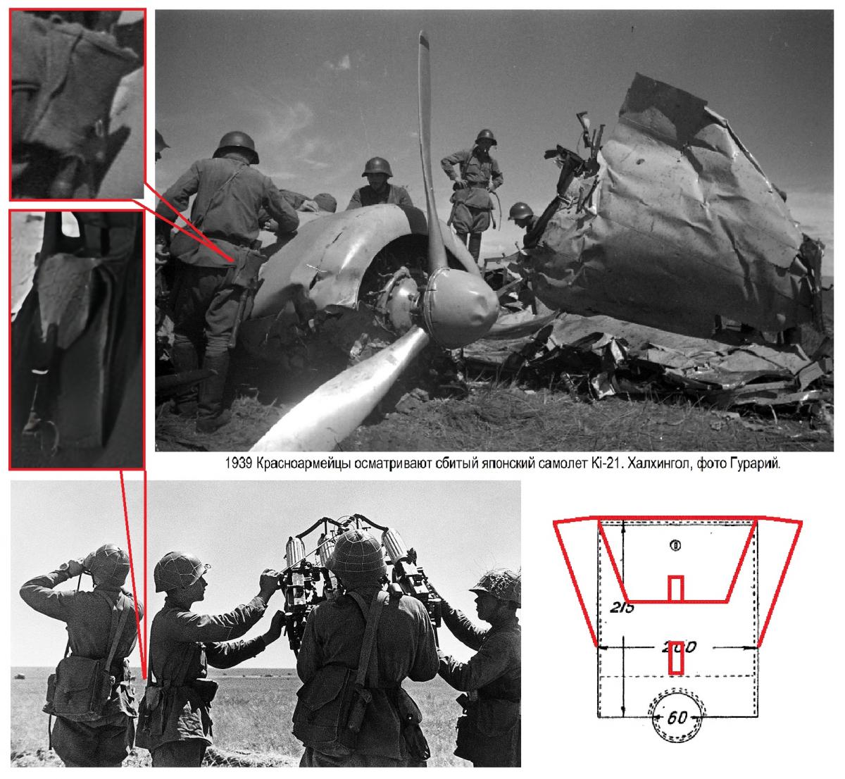 Эти же чехлы нарисованы в книжке Гербановского Самоокапывание пехоты 1939 года, которая в свою очередь является извлечением из Наставления по инженерному делу пехоты 1939 года, и они же в Как владеть лопатой 1939 года за авторством Ушакова, что говорит не о распространенности этого вида чехлов, а лишь об использовании рисунков одного автора и сделанных с фотографий с одних и тех же учений. Оригинальные чехлы этого вида неизвестны, но если все же поверить рисункам, то реальный чехол должен иметь клапан трапецевидной формы более длинный, чем на обычных для того времени чехлах.